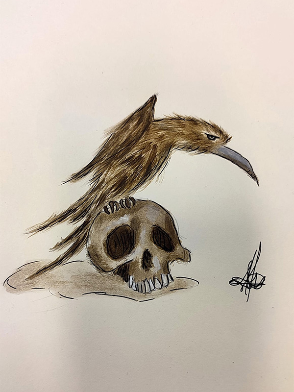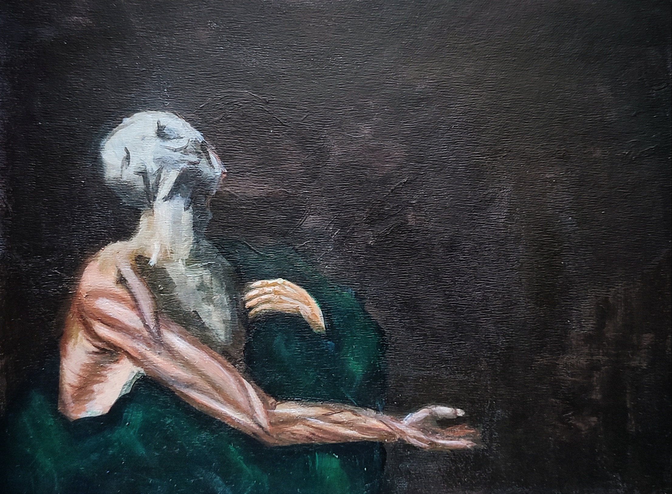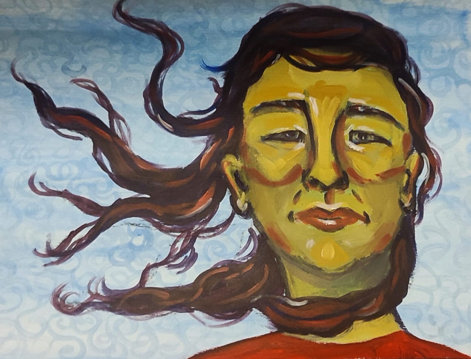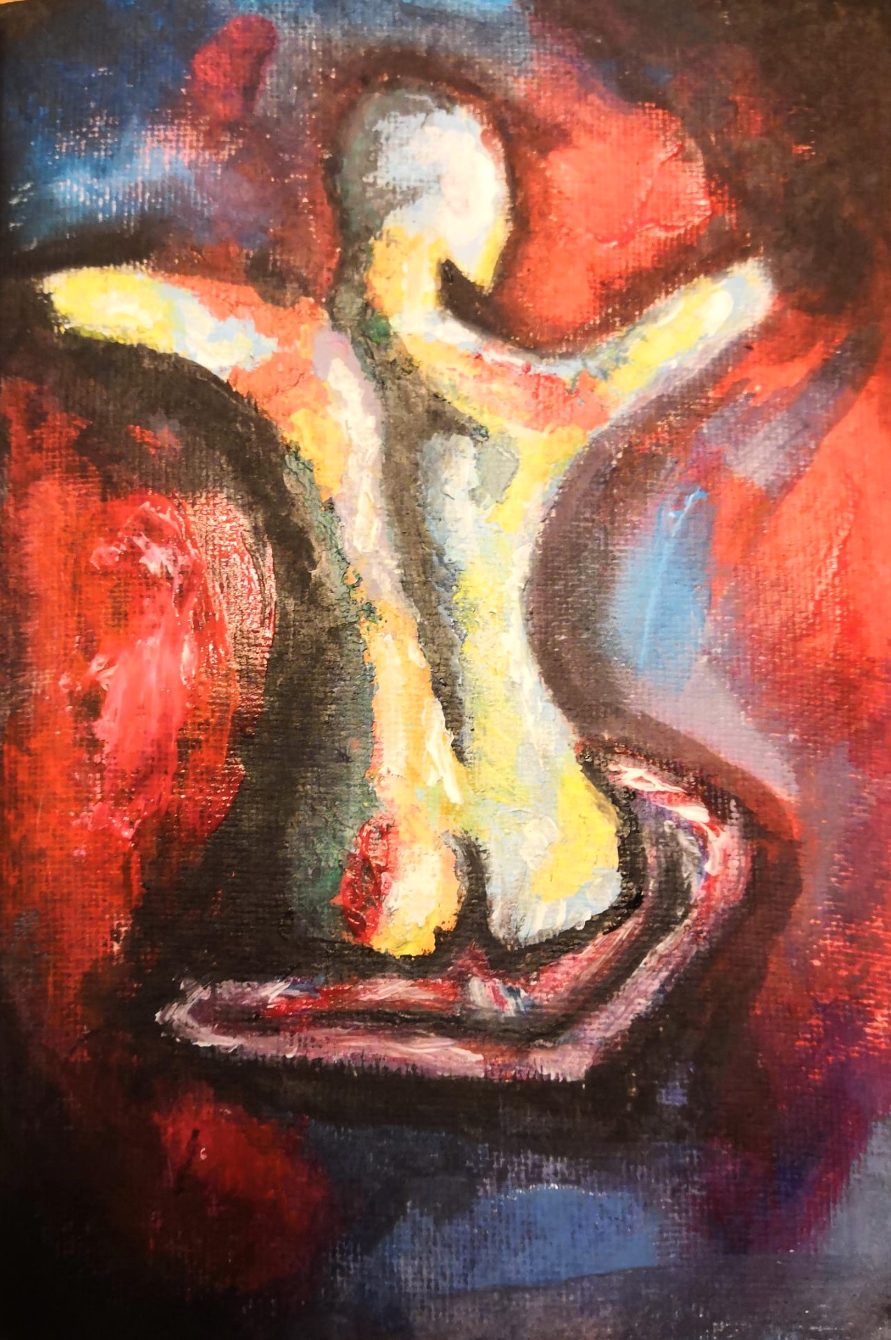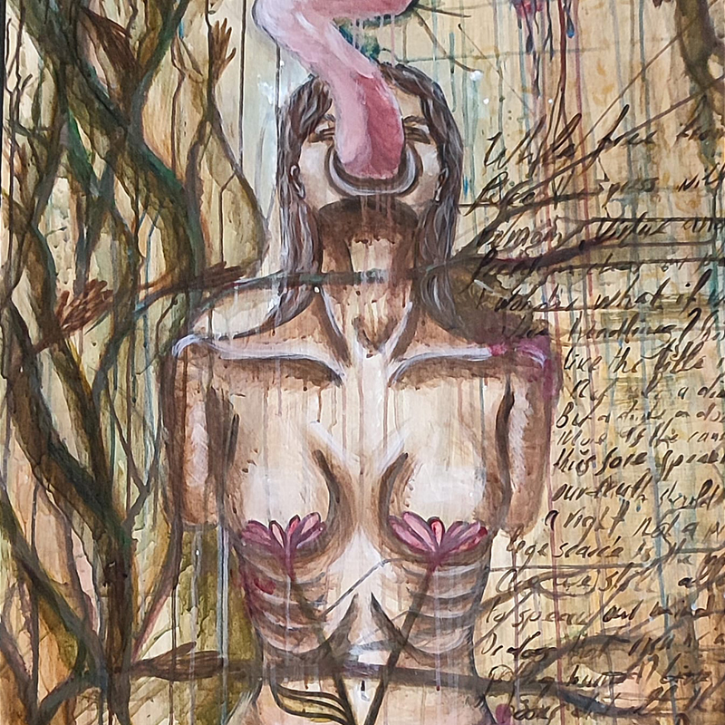 Dit werk gaat over persvrijheid. Ik wilde weergeven dat in de media men vaak de mond gesnoerd wordt of er andere woorden in de mond gelegd worden. Vandaar de tong en beker met bloed. Het gedicht aan de rechterkant is zelfgeschreven en gaat tevens over persvrijheid. De takken die haar overschaduwen staan symbool voor de belangenverstrengelingen die haar ook onder andere de keel aangrijpen.