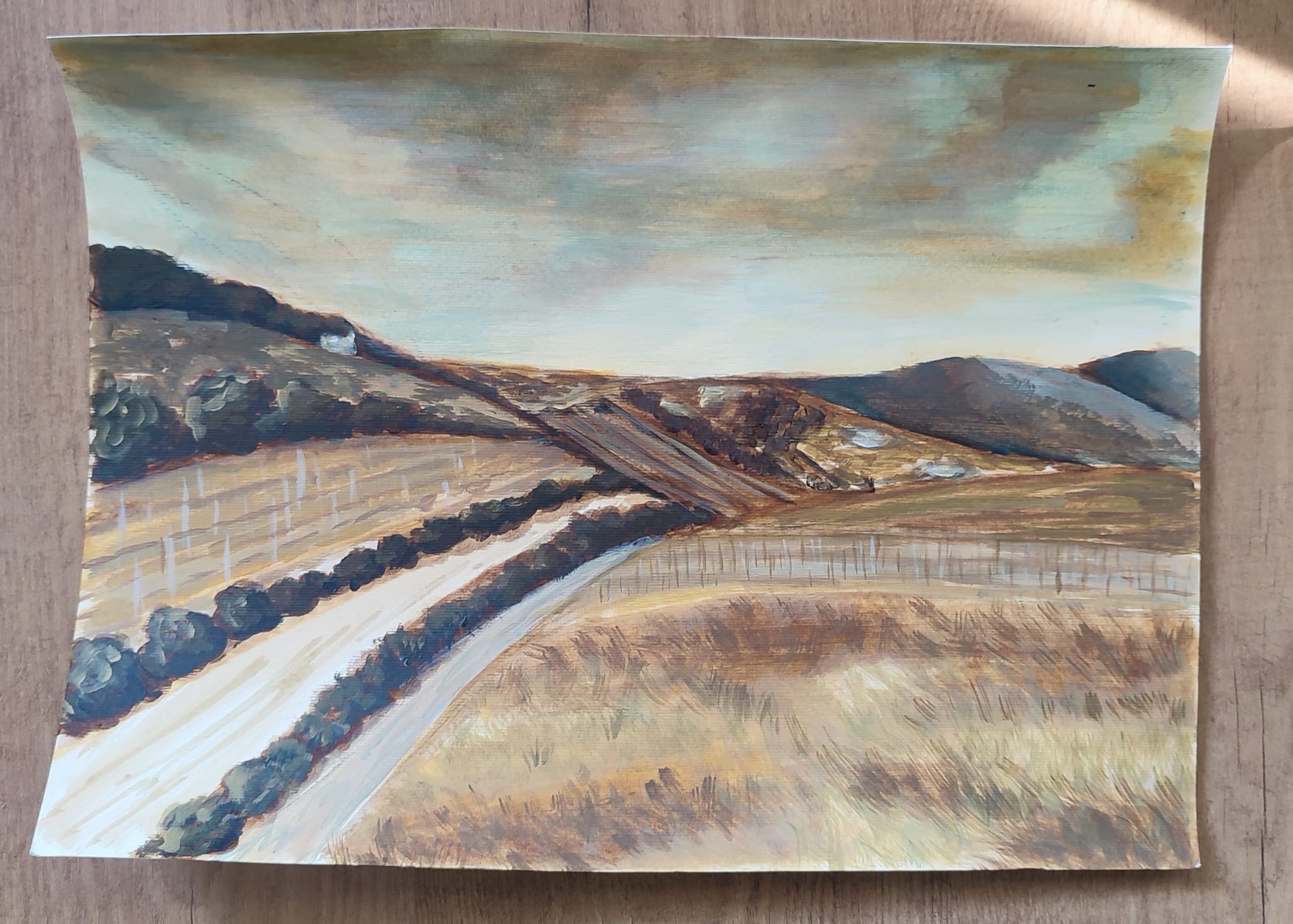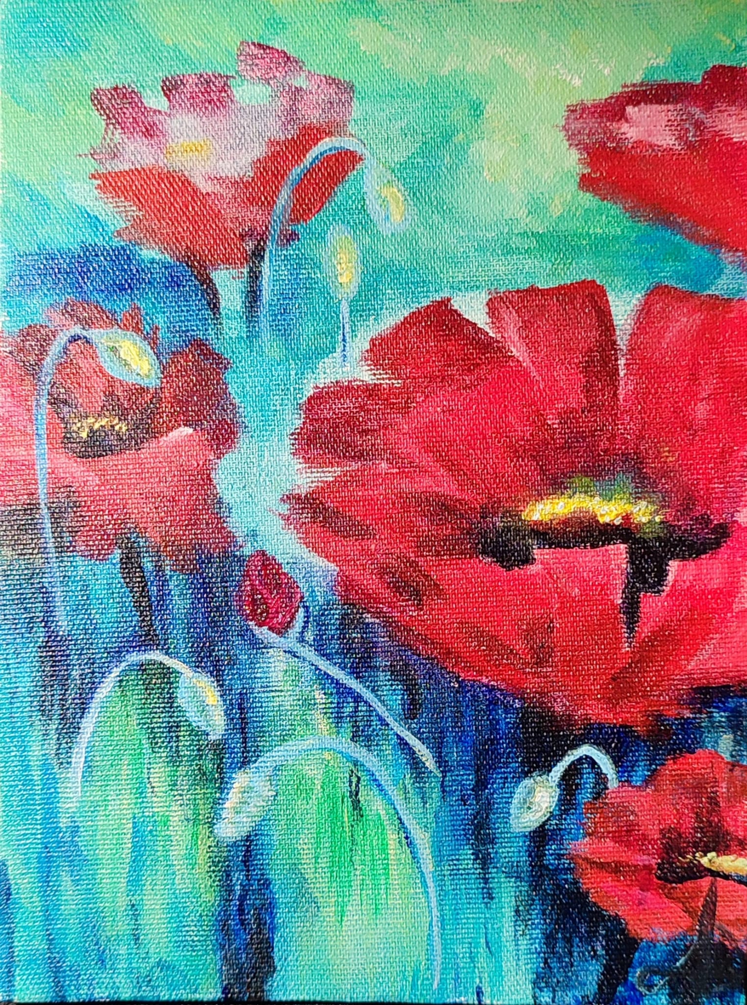 een aantal klaprozen. Mijn oma houdt heel erg van bloemen. Toen ze in het ziekenhuis lag genoot ze heel erg van alle bloemen die ze kreeg. Ik wilde ter eren daarvan wilde ik bloemen schilderen. Klaprozen staan symbool voor de wedergeboorte